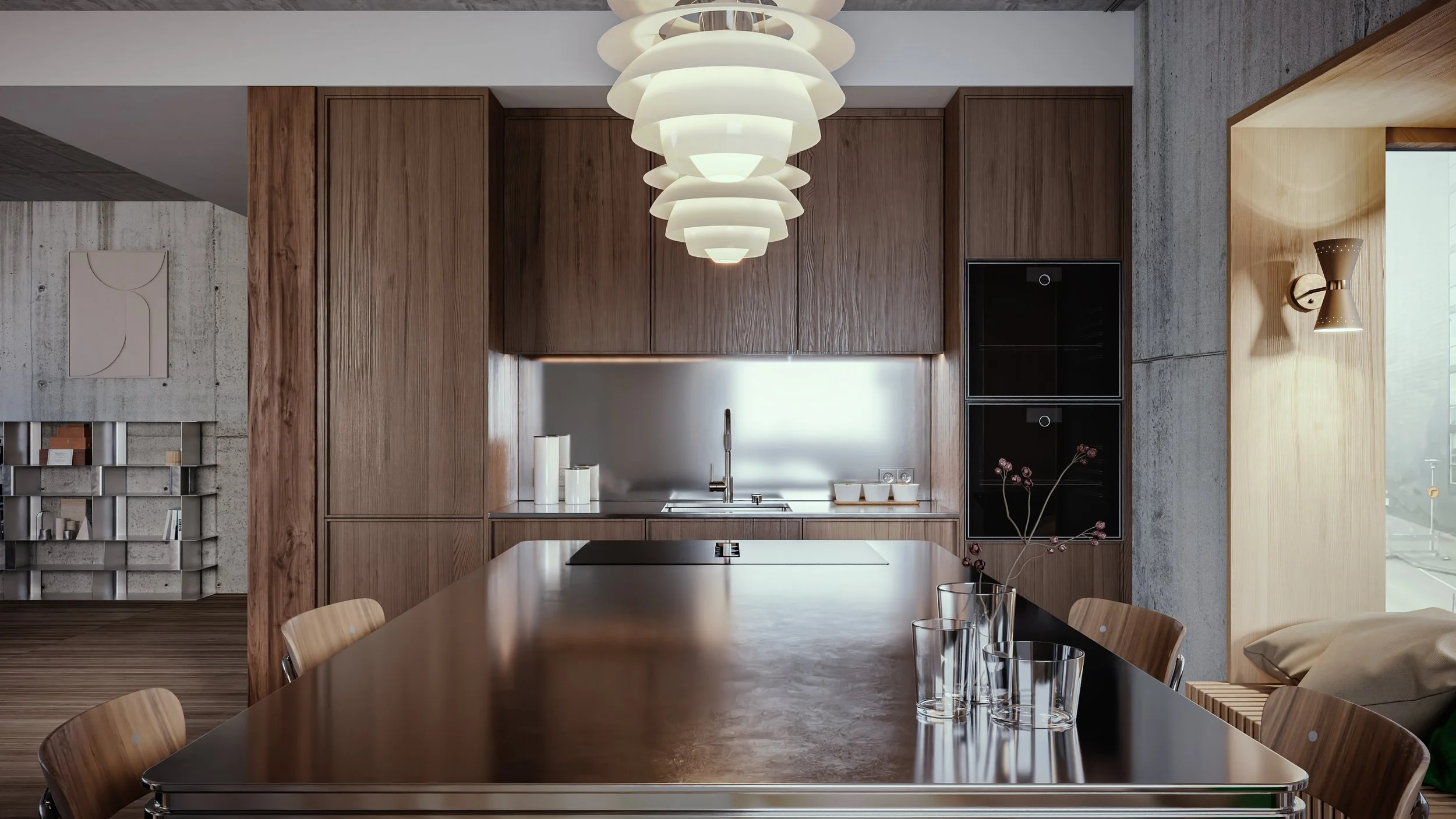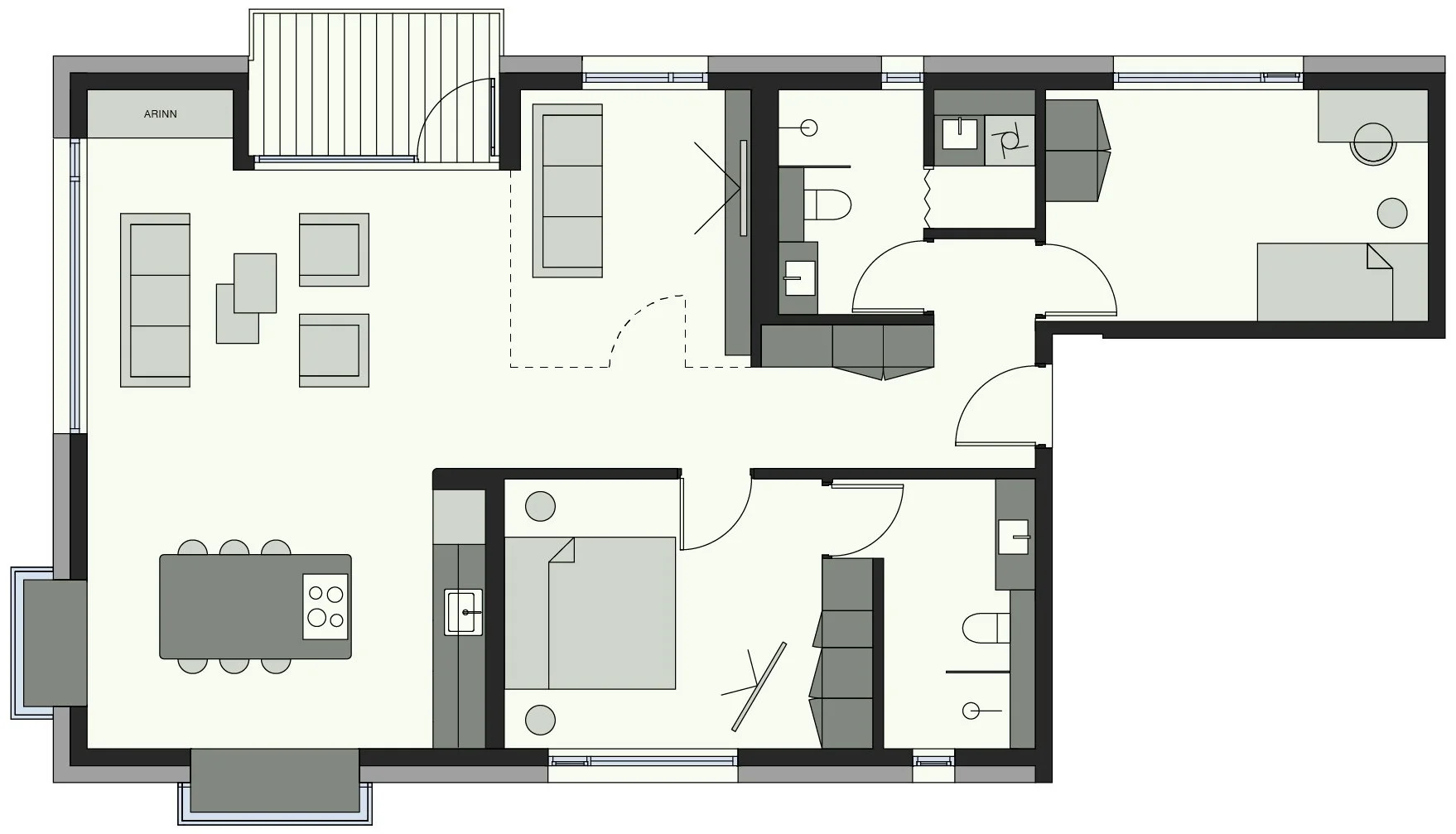 Gangur íbúðar er klæddur veggpanil úr hnotu sem sameinast eldhúsi auk þess sem fataskápur og setbekkur í anddyri eru einnig úr hnotu. Rúmgott svefnherbergi með skápum er næst anddyri. Á móti er annað baðherbergi og inn af því er þvottahús. Allir skápar íbúðar er sérsmíðaðir fyrir hvert rými og ná upp í loft. Möguleiki er á þriðja svefnherbergi eða skrifstofu með því að loka hluta stofunnar af. Íbúðinni fylgir lokaður bílskúr í bílakjallara og inn af honum er geymsla íbúðar.