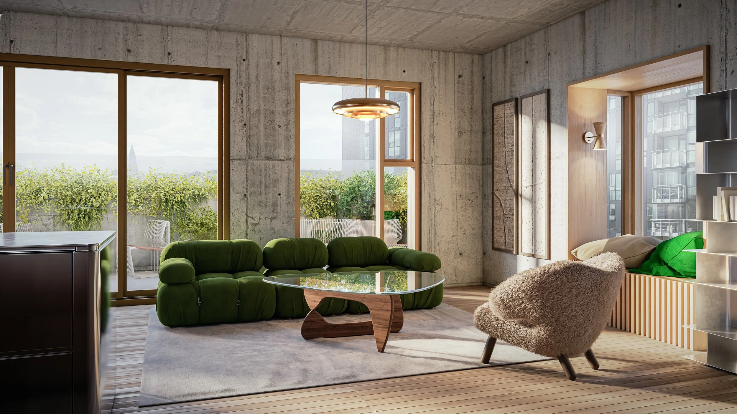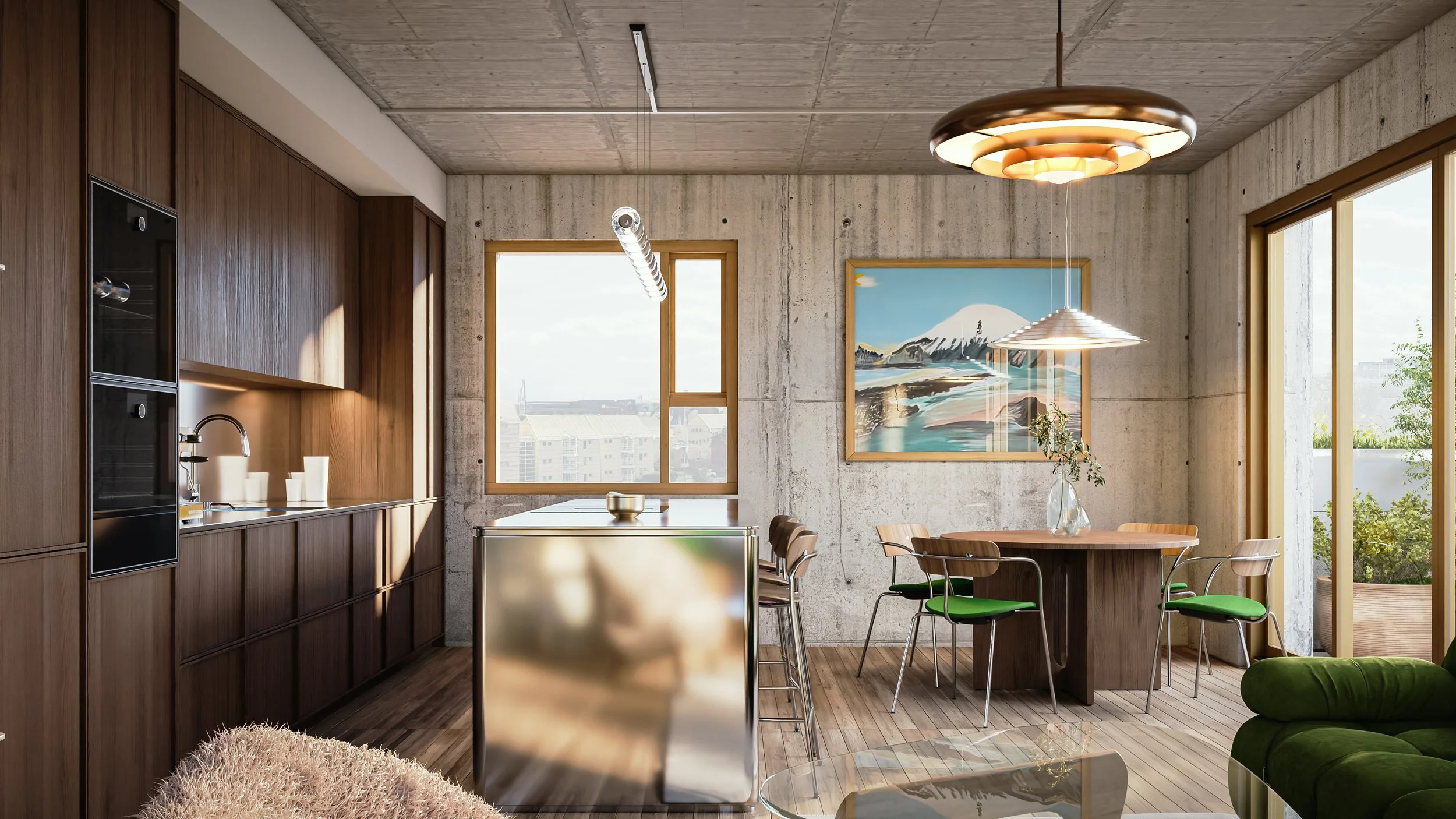 Íbúðin snýr að sjónum, hún er neðarlega í húsinu og mannlífið sést vel úr öllum áttum. Listaverkið Sólfarið eftir Jón Gunnar Árnason blasir við er setið er í útskotsglugga norðurhliðar. Þar er einstakt útsýni og tilvalið að tylla sér með bók undir lesljósi. Eldhúsið er opið og samtengt stofu. Í eldhúsi eru tveir ofnar, hefðbundinn ofn og ofn með val um stillingu á örbylgjueldun eða venjubundna eldun. Eldhúsinnrétting er sérsmíðuð úr hnotu með stáli í borðplötu og vaski. Eyjan er sérsmíðuð úr stáli, með ávölum brúnum á hliðum og borðplötu sem mætir neðri skápum eyjunnar með fallegri hönnun. Eldavél er á eyju með innbyggðan háf.
