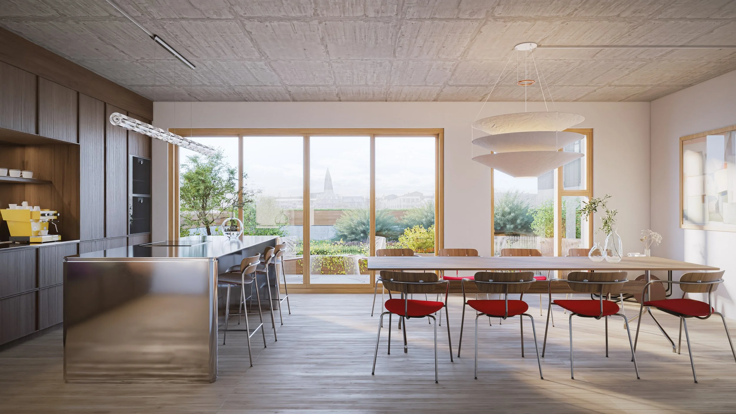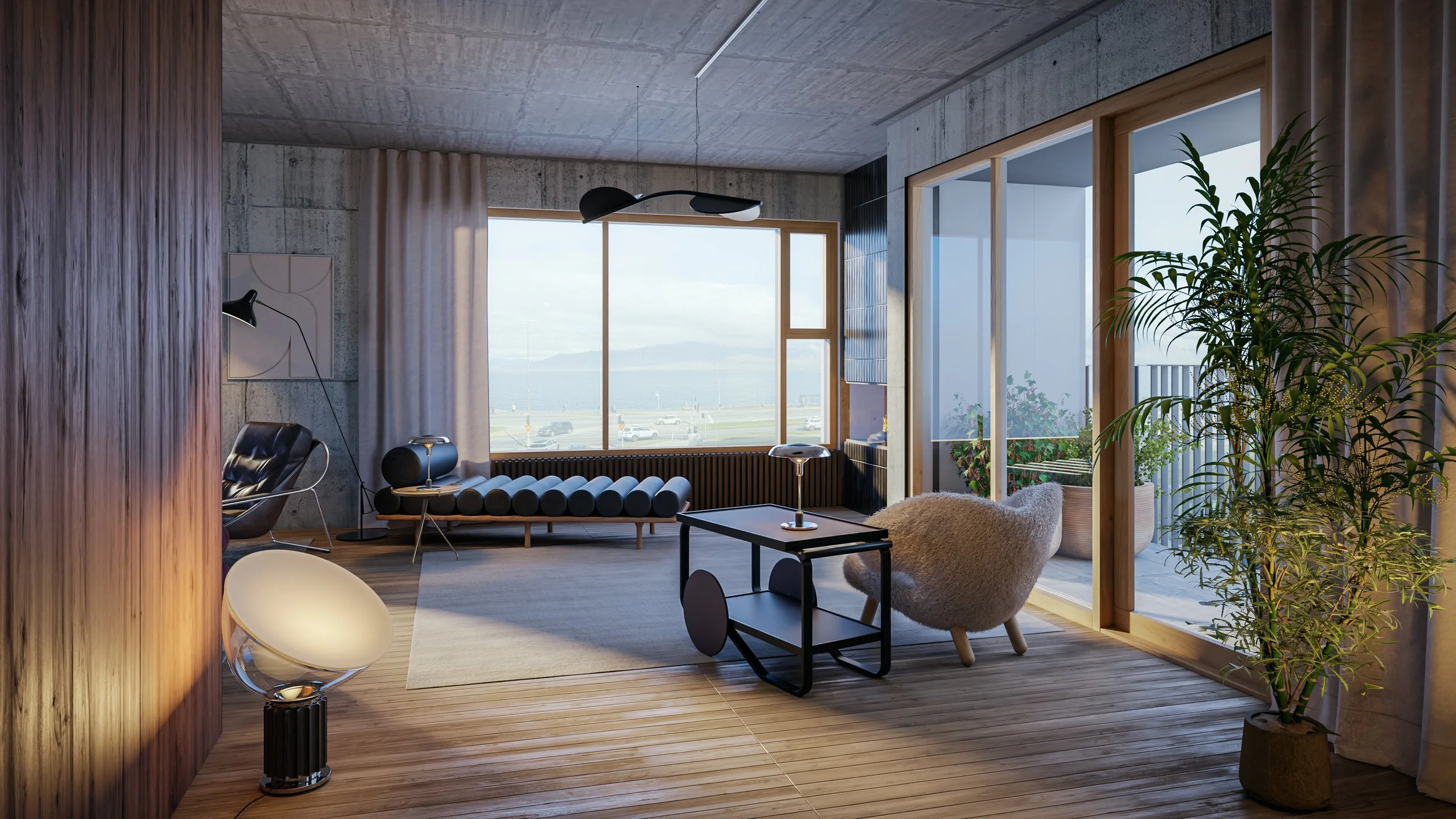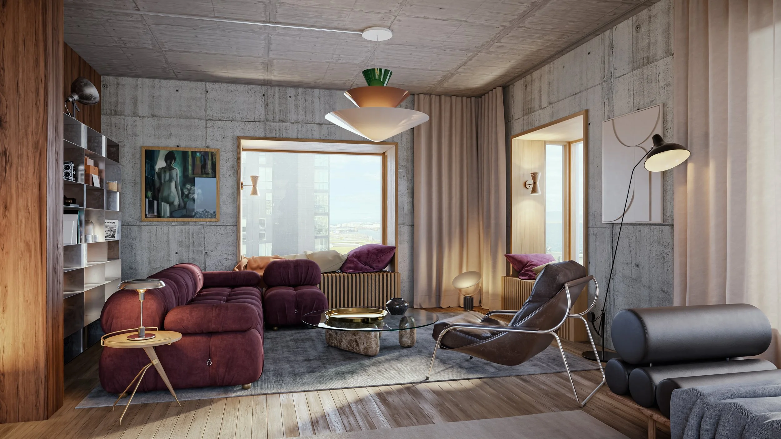 Íbúðin nær yfir allan gólfflöt fimmtu hæðar, hún er á næst efstu hæð hússins og héðan er stórfenglegt útsýni til allra átta. Listaverkið Sólfarið eftir Jón Gunnar Árnason blasir við úr útskotsglugga norðurhliðar. Þar er jafnframt einstakt útsýni og tilvalið að tylla sér með bók undir lesljósi. Stofa er staðsett í norðurhlið íbúðar með óheft útsýni út á haf. Stofuna prýðir arinn á austurhlið og hefur hver íbúð sér loftun. Á austurhlið íbúðar eru svalir með útsýni í norðvesturátt að Esju og Móskarðshnjúkum. Lyfta opnast beint inn í íbúðina. Gangur íbúðar er klæddur veggpanil úr hnotu sem sameinast eldhúsi auk þess sem fataskápur og setbekkur í anddyri eru einnig úr hnotu. Stórar þaksvalir sem vísa í suður eru út af eldhúsi og borðstofu en þar eru lagnir fyrir heitan pott.
