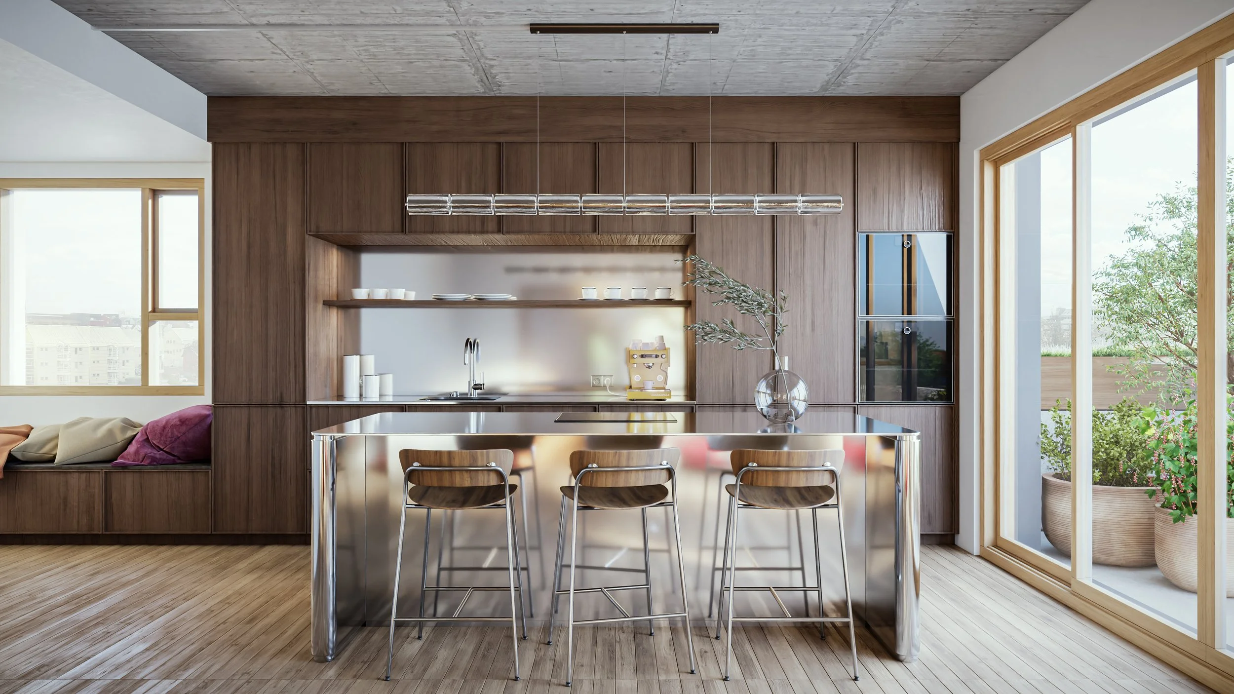 Eldhúsinnrétting er sérsmíðuð úr hnotu með stáli í borðplötu og vaski, þar eru tveir ofnar frá Gaggenau. Eyjan er sérsmíðuð úr stáli, með ávölum brúnum á hliðum og borðplötu sem mætir neðri skápum eyjunnar með fallegri hönnun. Eldavél er á eyju með innbyggðan háf og vínkæli frá Gaggenau. Hjónasvíta hefur innbyggð veggljós yfir rúmgafli og tvöfölda skápa. Þaðan er innangengt á baðherbergi þar sem flísalagt er upp í loft á þrenna vegu, þar eru innbyggðir speglaskápar og innrétting úr burgundy lituðum marmara. Sturta og handlaugartæki eru innbyggð frá VOLA og sturtuhaus er festur í loft. Annað baðherbergi er á gangi þar sem svartur og hvítur marmari prýðir innréttinguna ásamt dökkum flísum. Líkt og á hinu baðhergi íbúðar eru sturta og handlaugartæki innbyggð frá VOLA og sturtuhaus festur í loft.